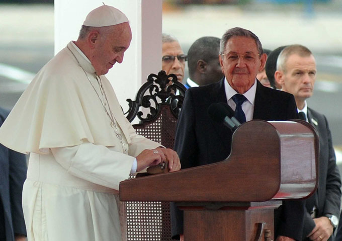 El Papa Francisco, Sumo Pontífice de la Iglesia Católica y Jefe del Estado de la Ciu¬dad del Vaticano, pronuncia unas palabras a su arribo al Aeropuerto Internacional José Martí, en La Habana, el 19 de septiembre de 2015. AIN FOTO/Abel PADRÓN PADILLA/sdl